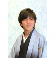 白地に青いスプレー模様の紙の背景になります。微妙な光沢があり、様々な色のお衣装との相性が良いです。被写体は男性に向きます。
